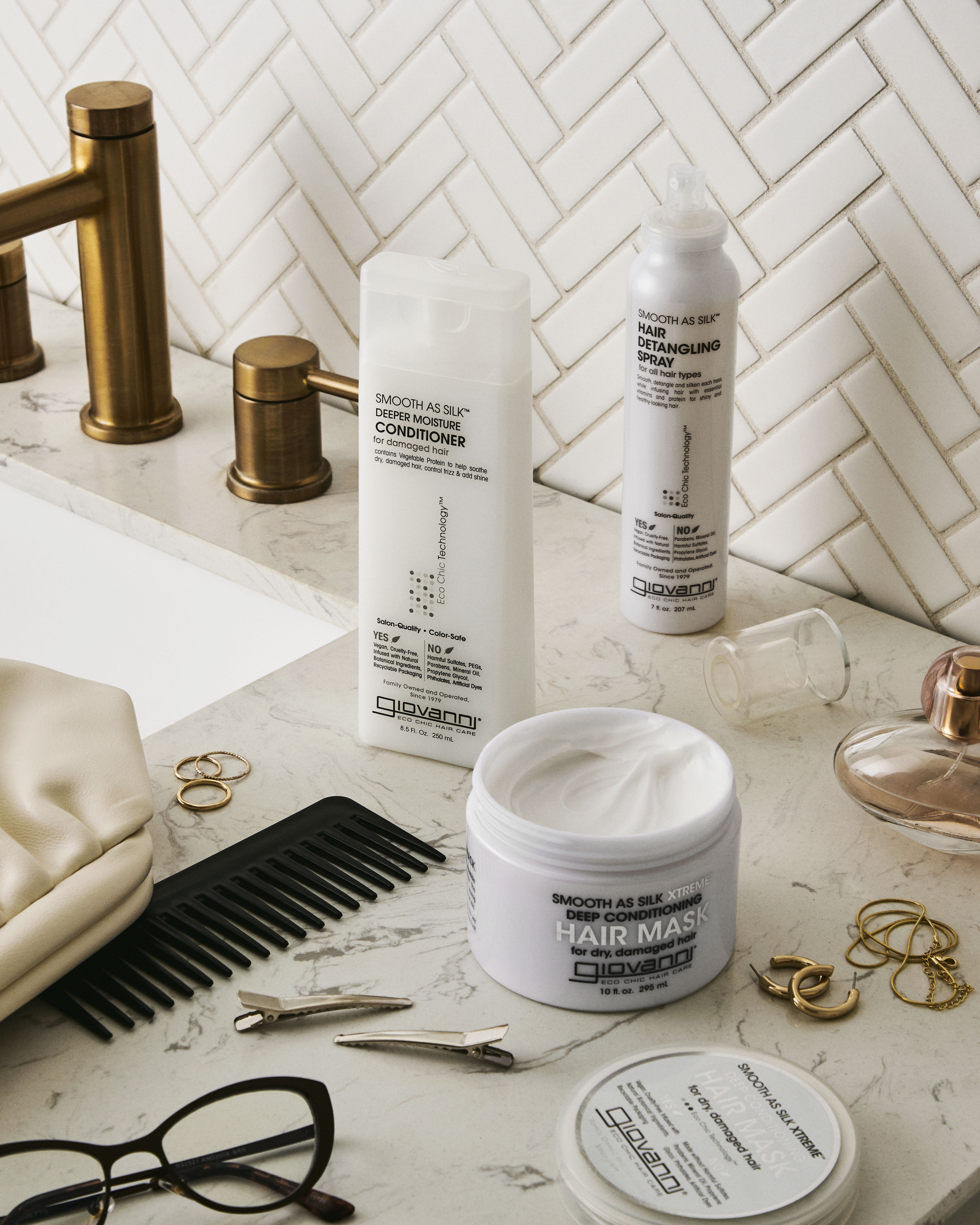 Apply Giovanni’s SMOOTH AS SILK™ conditioner daily after SMOOTH AS SILK™ Deep Moisture Shampoo. Massage through to ends before rinsing thoroughly. For silk smooth results, combine our color-safe deep conditioner and shampoo with the styling products in our Eco Chic® Hair Care collection for all hair types.