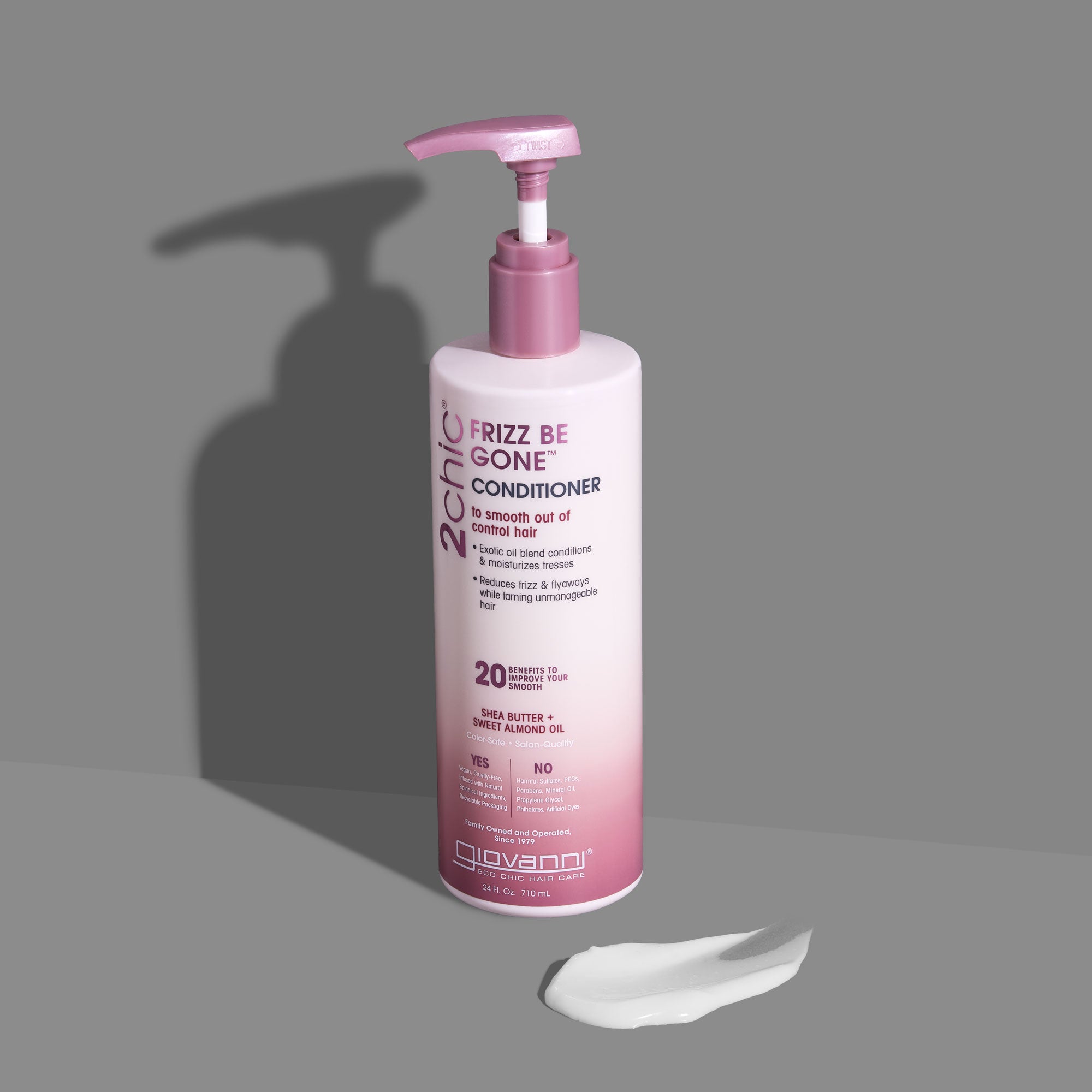 Frizz Be Still...improve your smooth with organic essential oils that know how to tame your mane. Giovanni® 2chic® Frizz Be Gone™ Conditioner contains our Dual Smoothing Complex of Shea Butter and Sweet Almond oil to control frizz and flyaways without weighing down your hair. It will drastically reduce frizz and leave your hair soft! This conditioner for dry, frizzy hair features a mix of Argan, Jojoba, and Coconut Oils that will wrap every strand in ultimate hydration while conquering even the most rebellious frizz. For best results, use after our 2chic® Frizz Be Gone™ Shampoo.